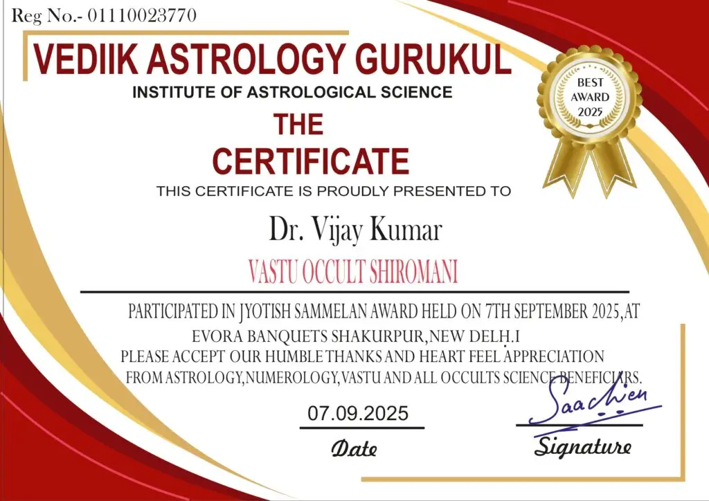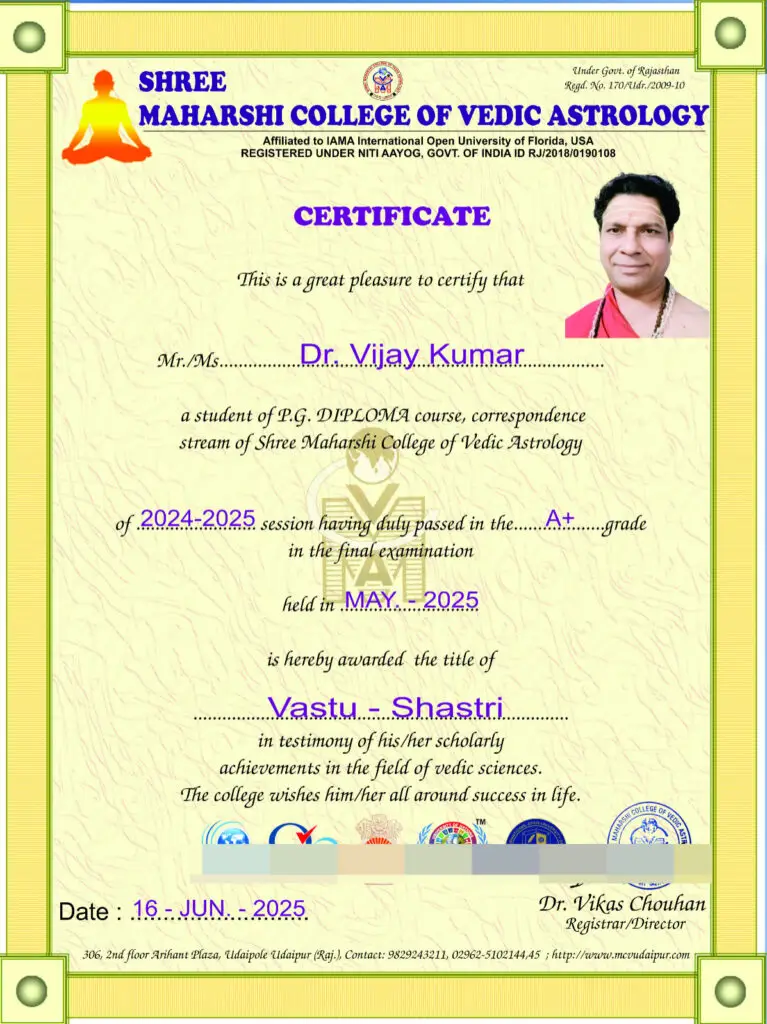 Dr. Vijay Vashist earned his Vastu Shastri degree through rigorous study and lineage-guided practice, integrating classical texts with contemporary applications. His approach honors the spiritual essence of Vastu while offering practical solutions for homes, institutions, and sacred spaces. This degree reflects not only academic achievement but also a dharmic commitment to restoring balance and resonance in the built environment.